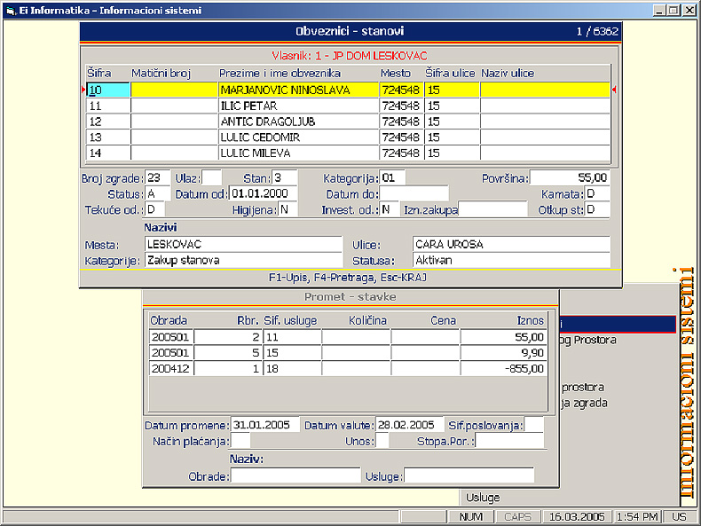 Matični podaci o stanovima sadrže šifru objekta (partije), ime i prezime vlasnika stana i njegov matični broj (JMBG), mesto i ulicu gde se nalazi stan, broj zgrade, ulaz i broj stana, status i površinu stana, datum od kada je stan useljen, da li ima neko održavanje (tekuće, investiciono, higijena), da li je stan otkupljen i, ako nije, iznos zakupa.